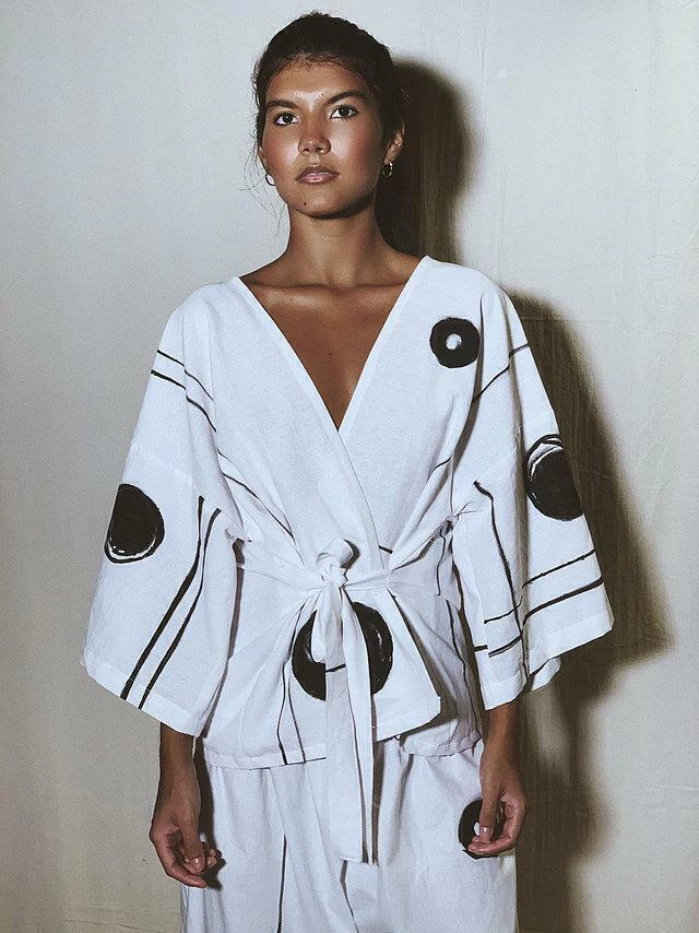 Reposição do conjunto PAZ em branco e preto. As peças são feitas em tecido de base de algoodão e estamparia artesanal, feita manualmente. As estampas são exclusivas e não se repetem. Variações da estampa, seguem um fluxo de efeito similar, mas jamais idêntico. Arte feita por Day Molina a partir do estudo de padronagens autorais da Nalimo. Vocês pediram e o conjunto PAZ está de volta ao nosso catálogo.